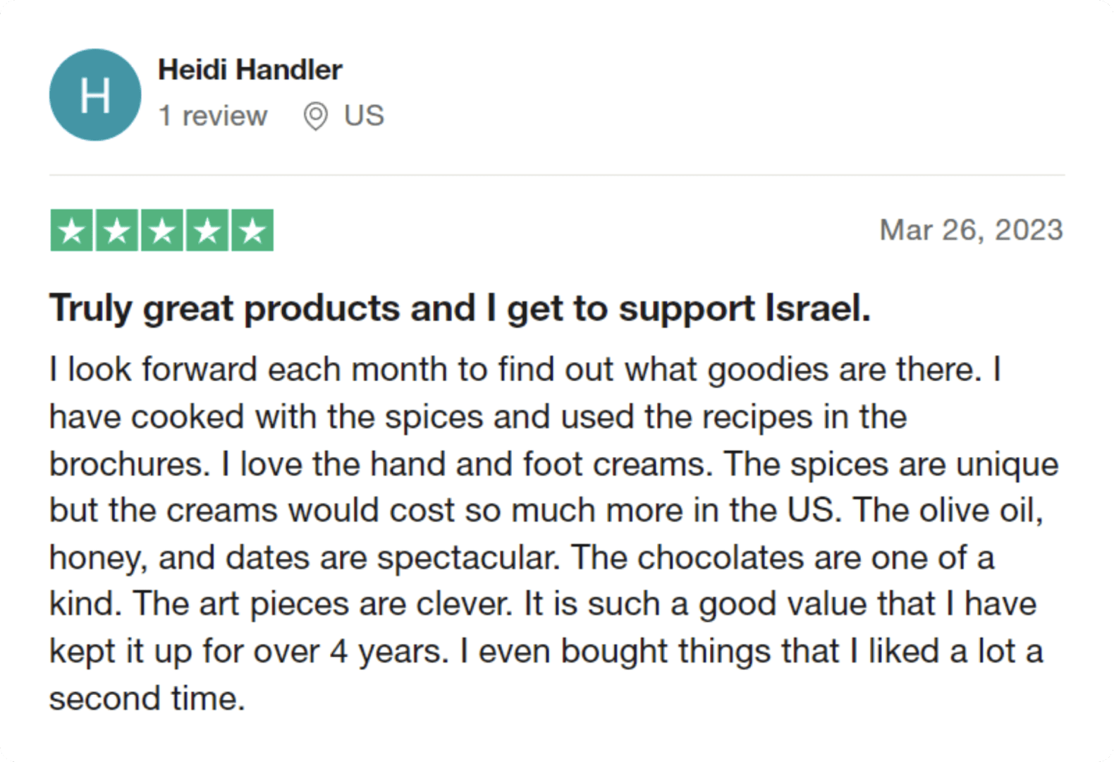 Our subscribers regularly receive themed boxes containing 7-9 unique and original products, many handmade, by local pioneers and artisans. By joining, they become part of our Israeli Family, giving support and receiving love from Israel every month!